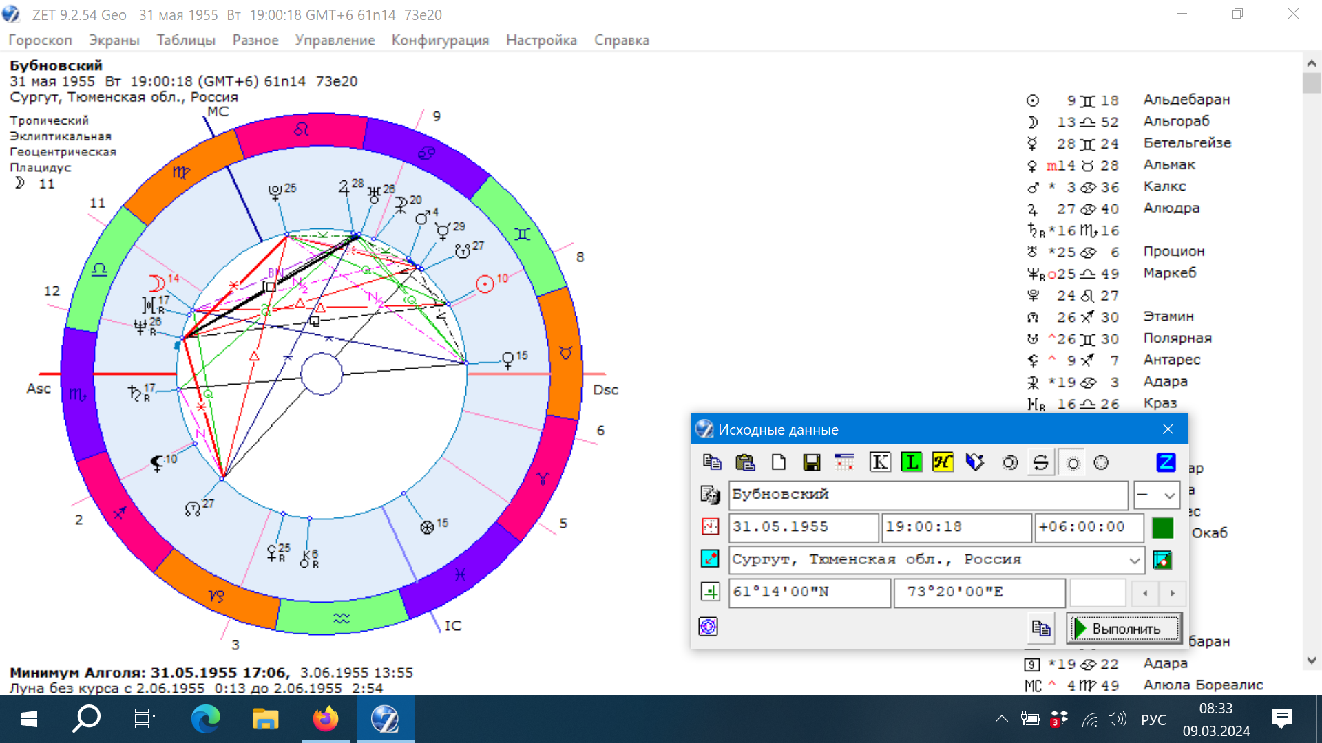 Рассмотрим гороскоп доктора С.М.Бубновского, известного своими центрами реабилитации. Родился 31.05.1955 в Сургуте. Времени рождения я не нашла. Поставила Солнце и Марс в 8 дом, Сатурн в 1й дом вблизи асцендента, так как я вижу в его внешности Сатурн. Он выглядит как робот-терминатор для меня.