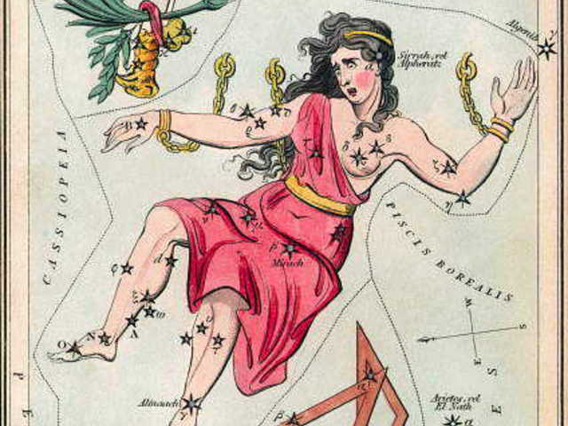 У эфиопского царя Цефея и его жены Кассиопеи была дочь Андромеда. Гордясь красотой своей дочери, Кассиопея объявила, что Андромеда прекраснее любой из нереид - красивых молодых жительниц морских глубин, многочисленных дочерей бога Эгейского моря Нерея. Обиженные нереиды пожаловались главному богу морей Посейдону, а тот, разгневавшись, послал к берегам Эфиопии чудовище, пожиравшее людей. Местный эфиопский оракул возвестил, что страна может избавиться от чудовища, если ему будет отдана на съедение Андромеда. Так и пришлось поступить. Андромеду приковали цепями к прибрежной скале; её прикованные распростёртые в обе стороны руки изображены цепочкой ярких звёзд. А в тоже время молодой герой Персей, выполнял повеление своего владыки Полидекта, царя острова Серифоса в Критском море, добрался до логова злобной женщины-чудовища - одноглазой Медузы, на голове которой вились змеи, а взгляд обращал всё живое в камень. Персей застал Медузу спящей, но, на всякий случай , подошёл к ней спиной, смотря в отражение Медузы в своём полированном щите. Когда он отрубил Медузе голову, то из её туловища родился крылатый конь Пегас, а Персей взяв её голову с собой, полетел на своих крылатых сандалиях обратно к острову Серифосу. Но на пути домой Персей увидел прикованную к скале Андромеду и подбиравшееся к ней чудовище. Персей направил на него голову Медузы, и под её взглядом чудовище окаменело. Освобождённая Андромеда вышла замуж за Персея и вместе с ним покинула Эфиопию.