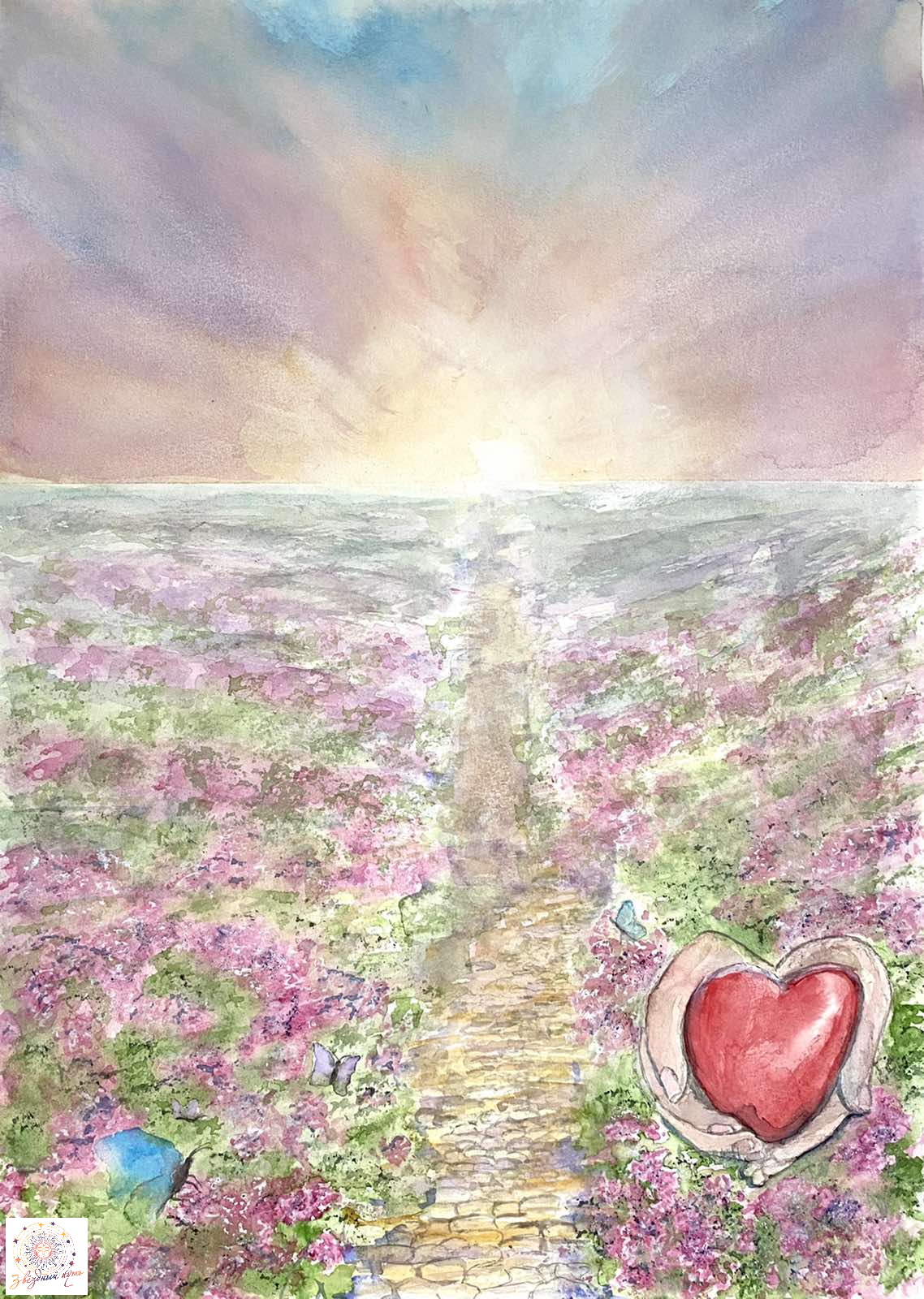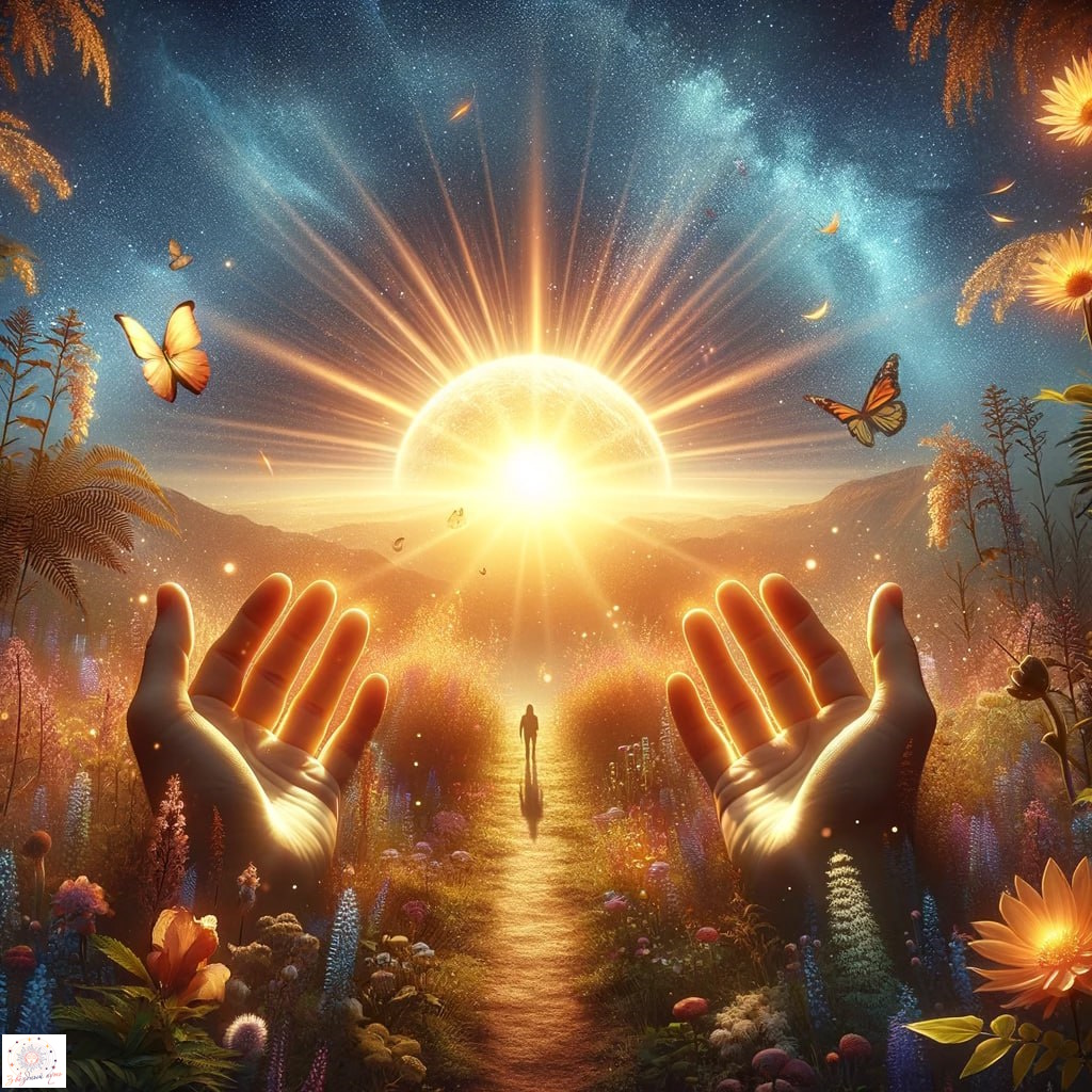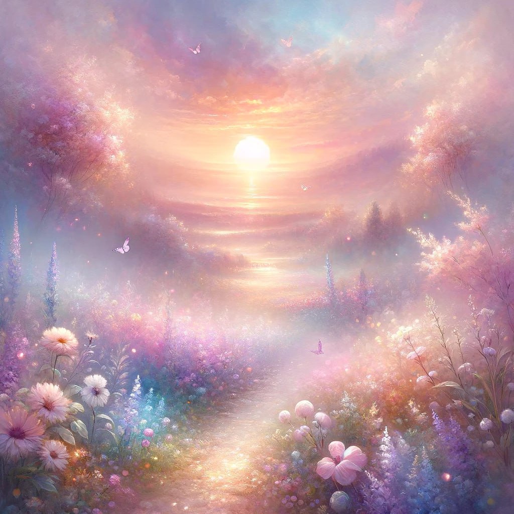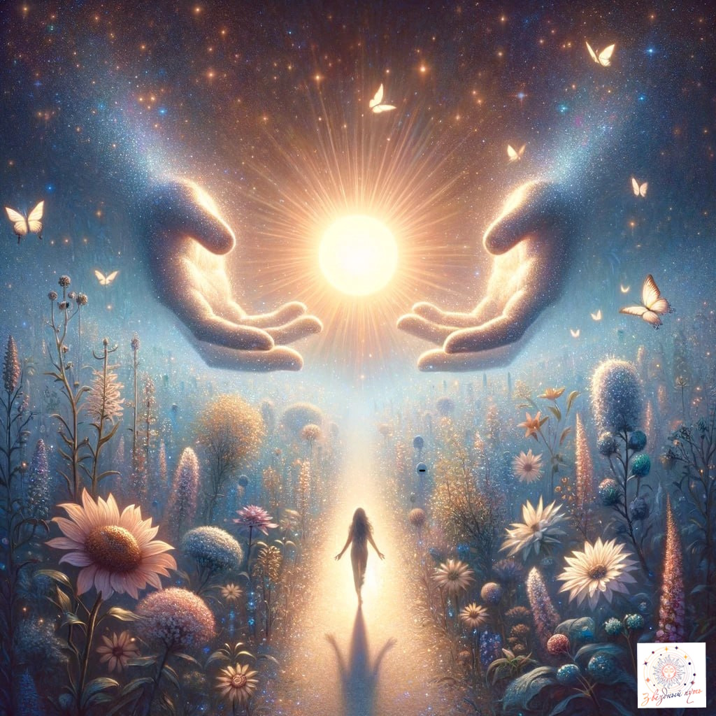 Перед вами сияющее пространство. Вдали виднеется рассветное солнце. Мир искрится. Солнце и все пространство как в дымке. Пространство, как сияющий плотный туман. Вы идете по дороге между душистых трав и цветов к Солнцу. Вас наполняет аромат цветущих растений. Вы видите, как над цветами летают бабочки. Вы слышите, как поют птицы. Вы становитесь легкими и воздушными. У вас как будто вырастают крылья. Из пространства к вам протянуты две большие ладони. Вас обнимают руки любви. Вас любят, вам можно все, как любимому ребенку. Вас любит мир. Вы идете по дороге любви.