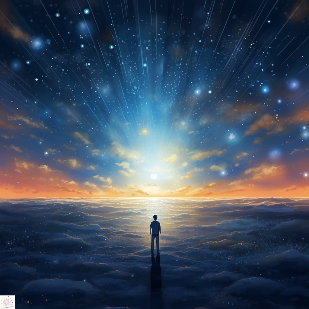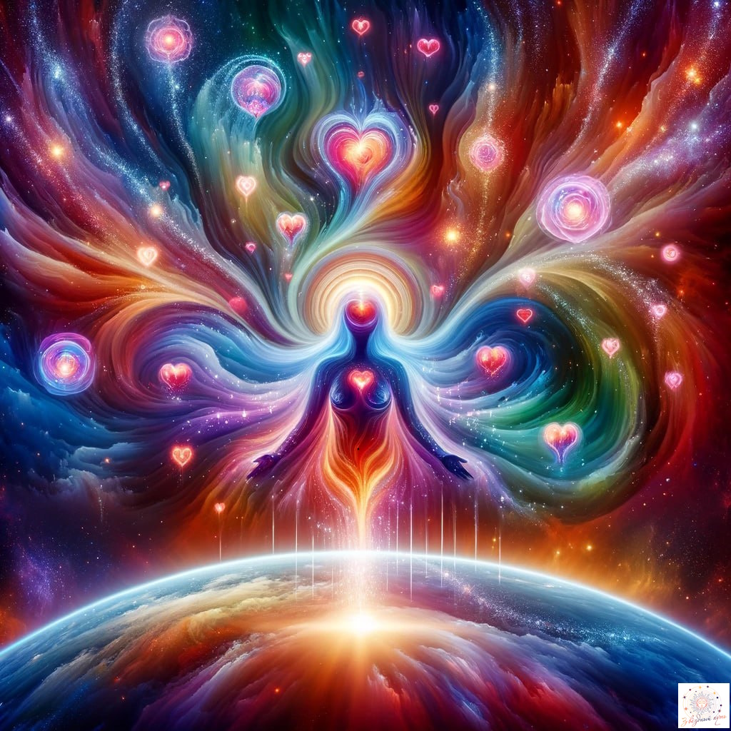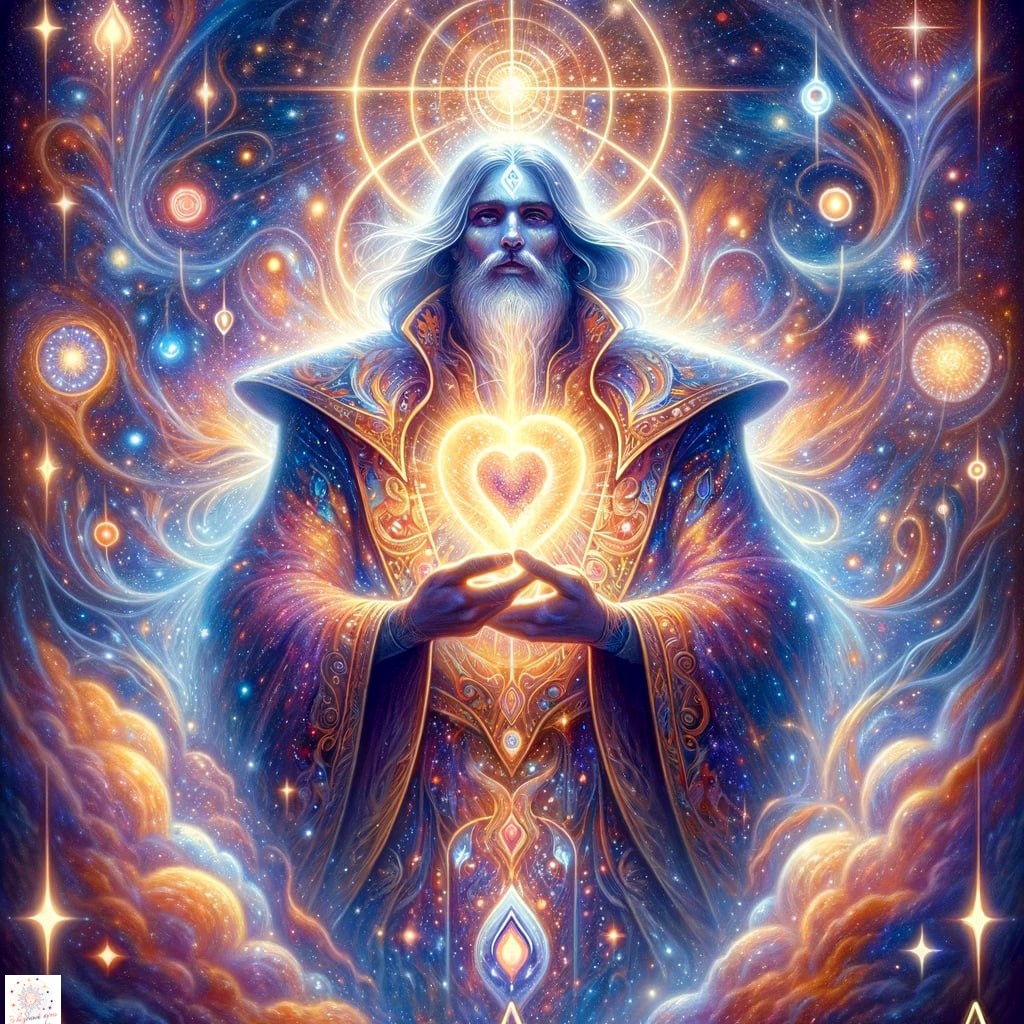 Эта карта изображает величественное и таинственное существо, обладающее непостижимой мудростью и мощью. Его облик мерцающий и изменчивый, словно состоит из звездного неба и света далеких галактик. Туз Любви находится в центре космической гармонии, облеченный в одежды, которые меняют цвета и узоры в ритме вселенской музыки.