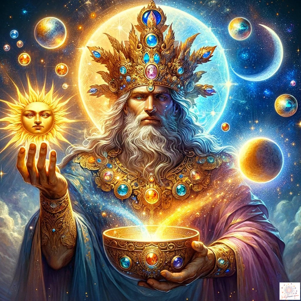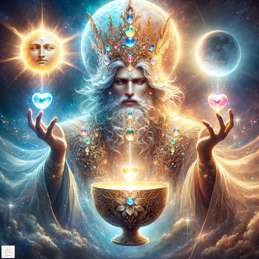 Король любви держит в одной руке Солнце, в другой руке Луну. Он их соединяет в чаше любви. В одной руке солнечный свет, в другой синий лунный свет.