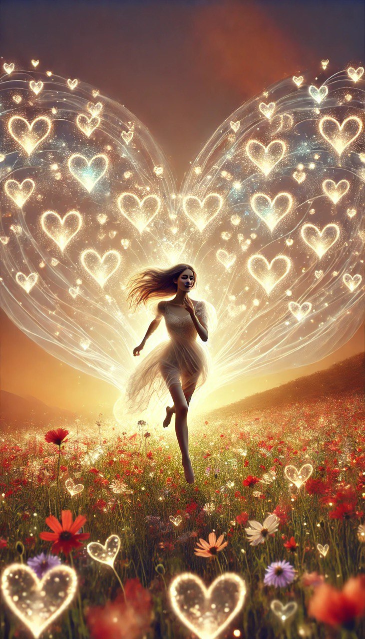 Человека окружает поле любви и притяжения, состоящее из сверкающих живых маленьких сердец.