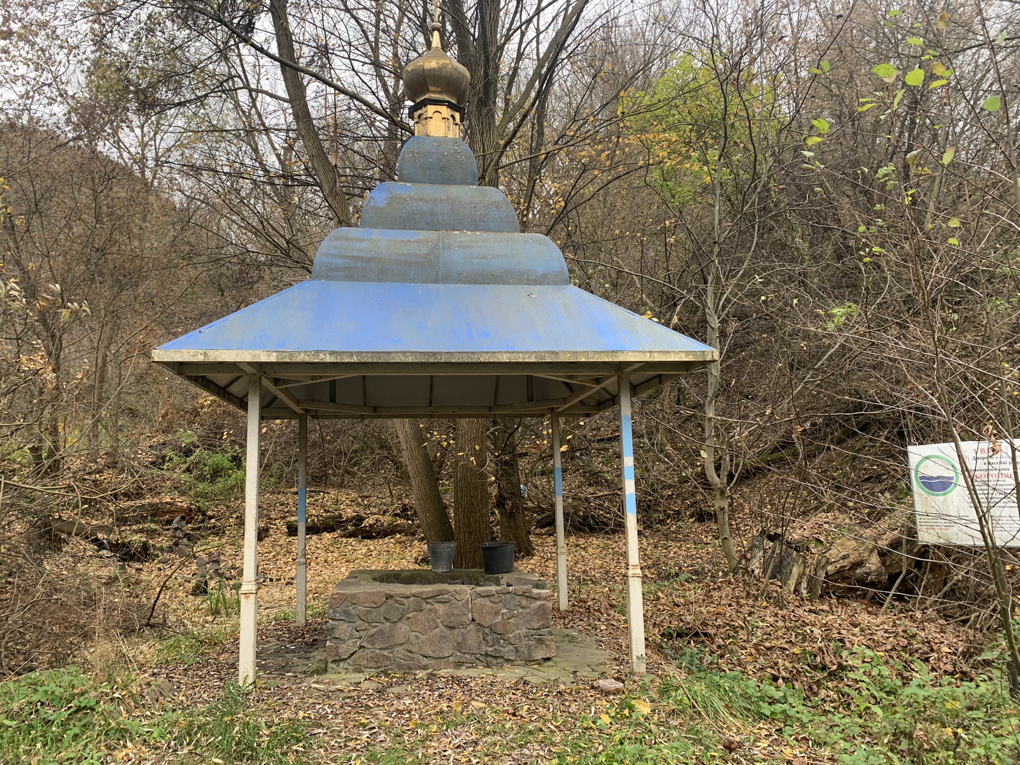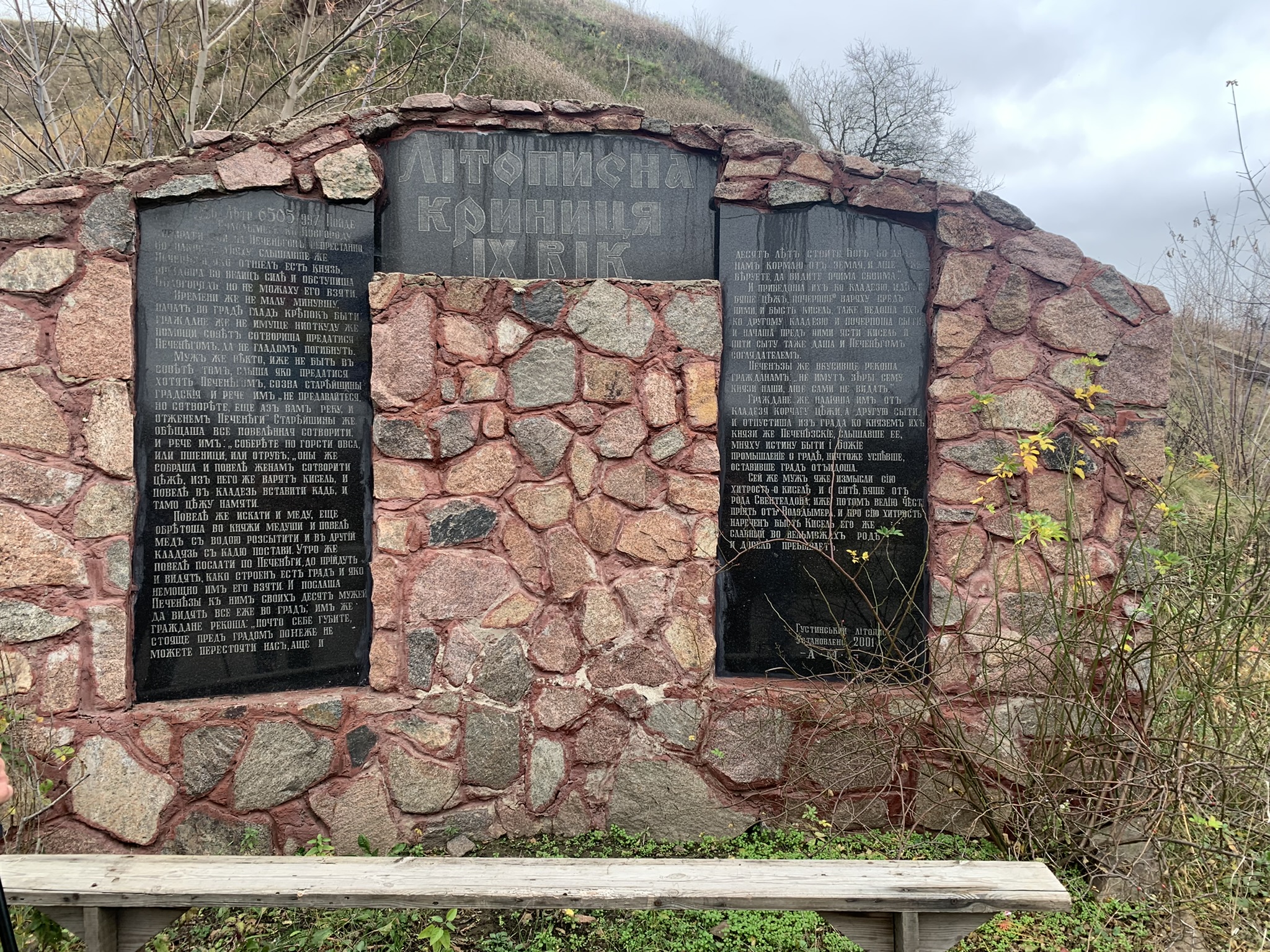 Дорога приводить мене до Літописної Криниці. Напис переносить мене у минуле у події 997 року. Давня боротьба з печенігами відображена у легенді про "білгородський кисіль". Ця легенда відбита на красному камені. Зверху на горі стоїть великий хрест.
