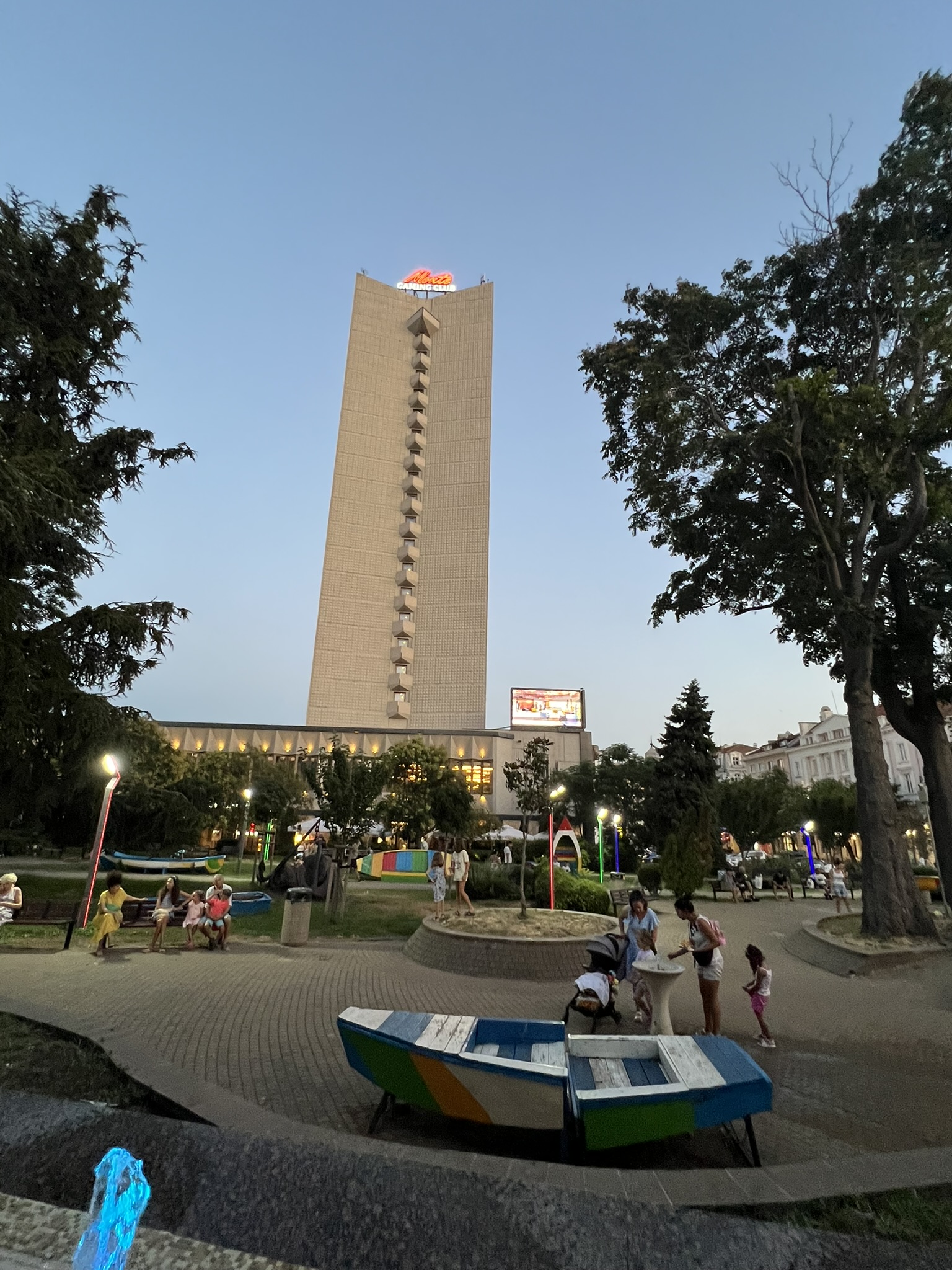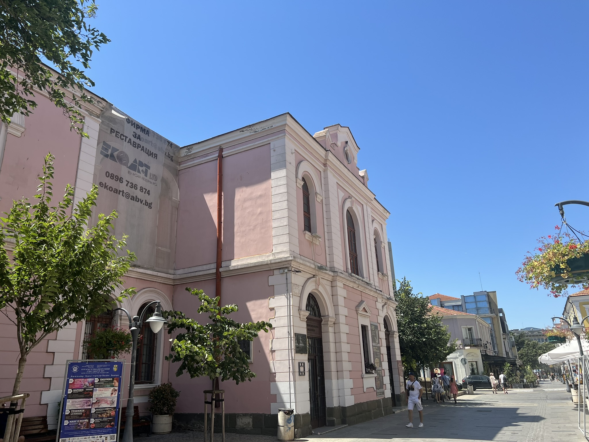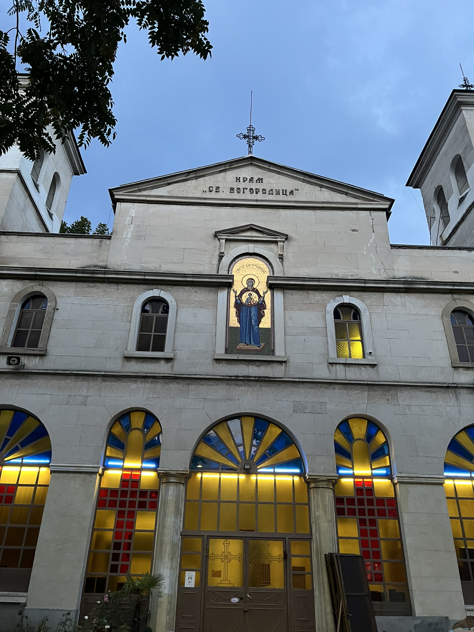 В воскресенье во время службы перед входом в собор стояли нищие и убогие и мне не захотелось идти сквозь их строй. Снимут не деньгами, так энергией. А я восстанавливаюсь от войны. Мы живем в районе жилищного комплекса Възраждане. От дома до моря идти 20 минут. По дороге от дома к собору я прохожу мимо театра, через арку Николая Угодника - покровителя города, затем через знак географического центра города - километр зеро.