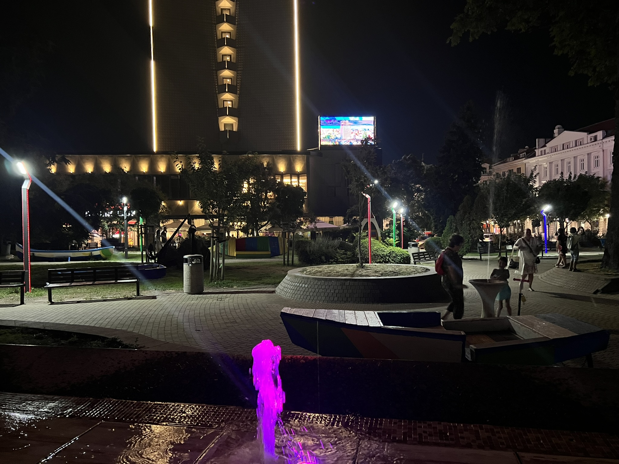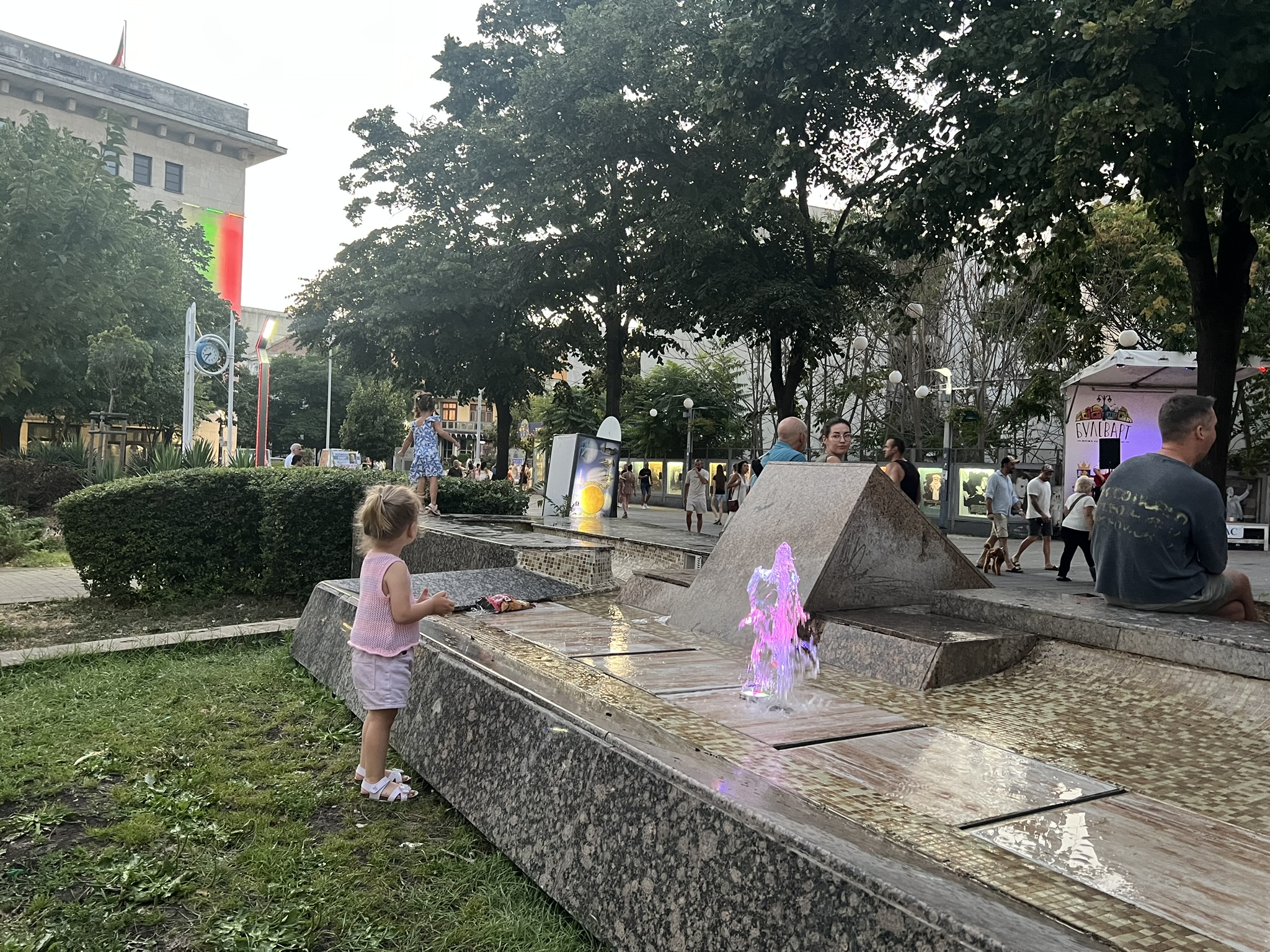 Везде стоят фонтанчики для питья и фонтаны для красоты. А вечером в центре работает фонтан с подсветкой.