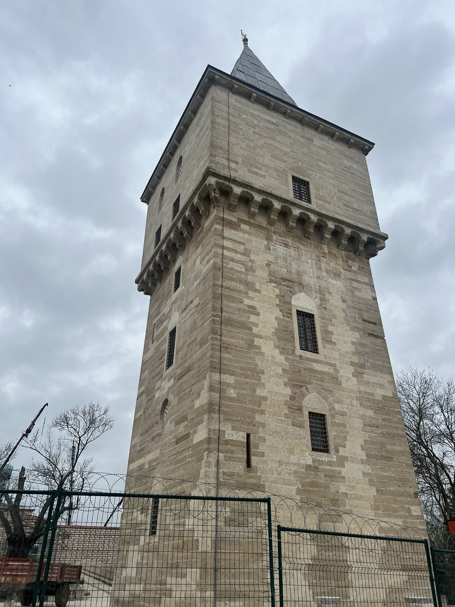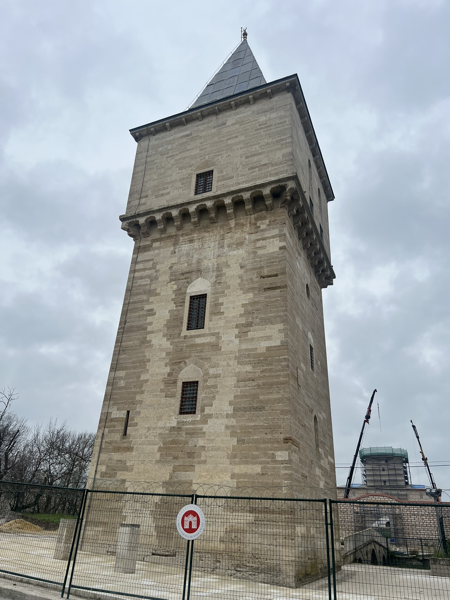 Подошла к башне Правосудия. Башню построил знаменитый архитектор Мимар Синан в 1561 году по распоряжению султана Сулеймана Великолепного. Конструкция башни довольно интересна: она состоит из четырёх этажей, которые венчает острая вершина. На самом верху башни находится мраморный фонтан и небольшой бассейн. В этой башне решались самые важные судебные дела империи. Она стояла целая и ухоженная, но огороженная сеткой за которой виднелась охрана. Дальше виднелся дворец Баязида весь в строительных лесах.
