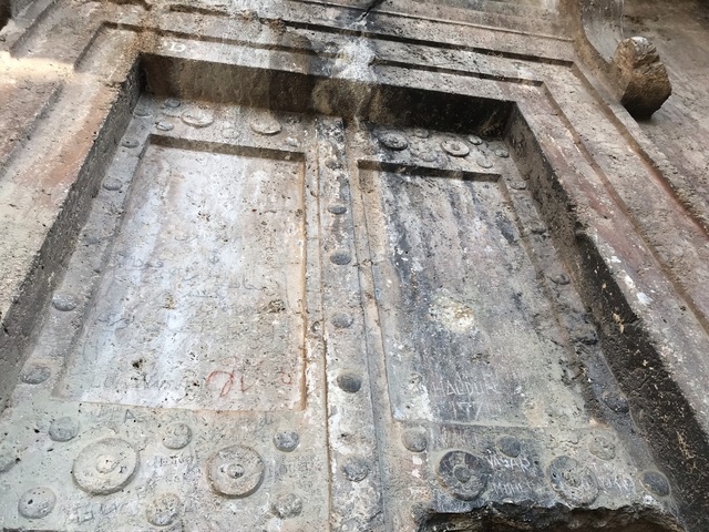 Дверь украшена круглыми каменными шайбами.