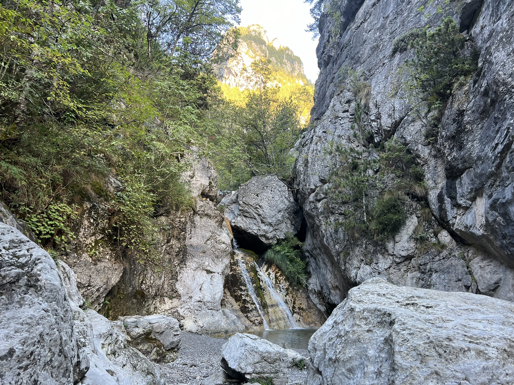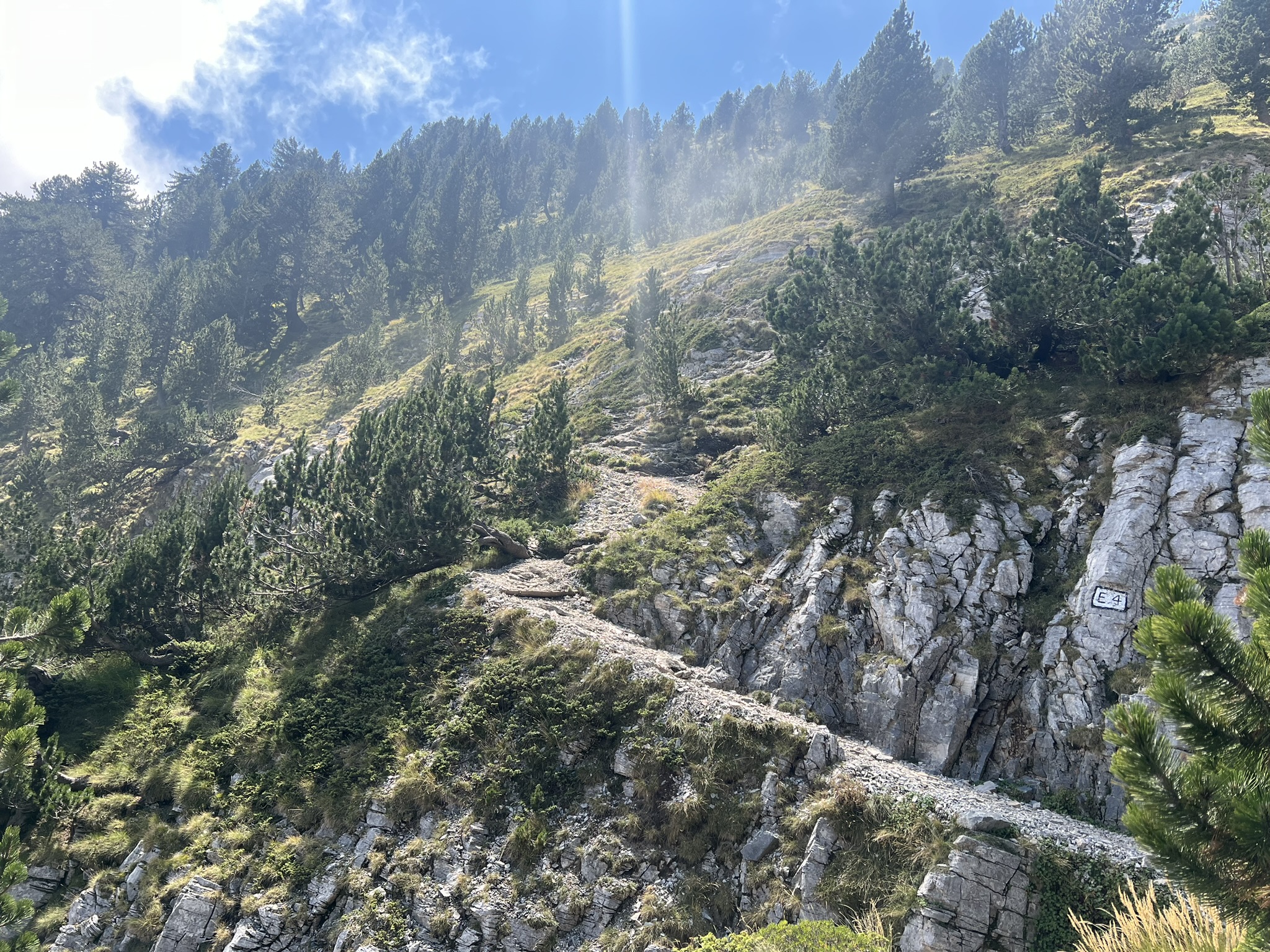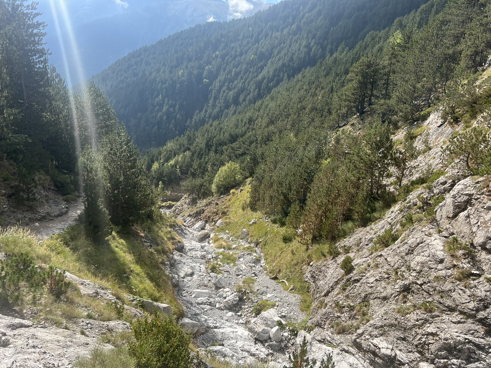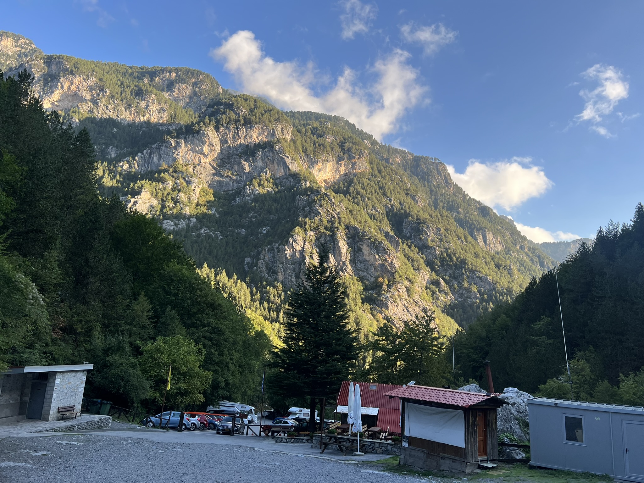 На высоте 2100 метров находится приют, где можно выпить чаю, перекусить и заночевать. Таксист пока вез нас до Прионии все время отговаривал и пугал: “Камни падают, дорога трудная. Идите лучше не наверх а по дороге до Литохоро и погуляете и красоты природы посмотрите и не опасно”.