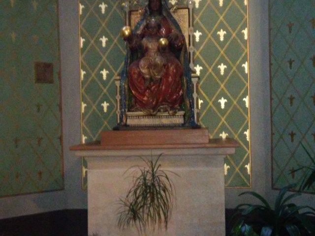 Это статуя Мосерратской богоматери 1636 года, принесенная испанскими монахами-бенедиктинцами. У девы Марии в руке золотой шар из которого растёт ветка с лилиями. У младенца Иисуса в руке такой же золотой шар с крестом. Золото с чёрным притягивает взгляд. Возле чёрной Мадонны стоит сильное энергетическое поле голубого и светлого цвета. Пространство плотное киселеобразное.