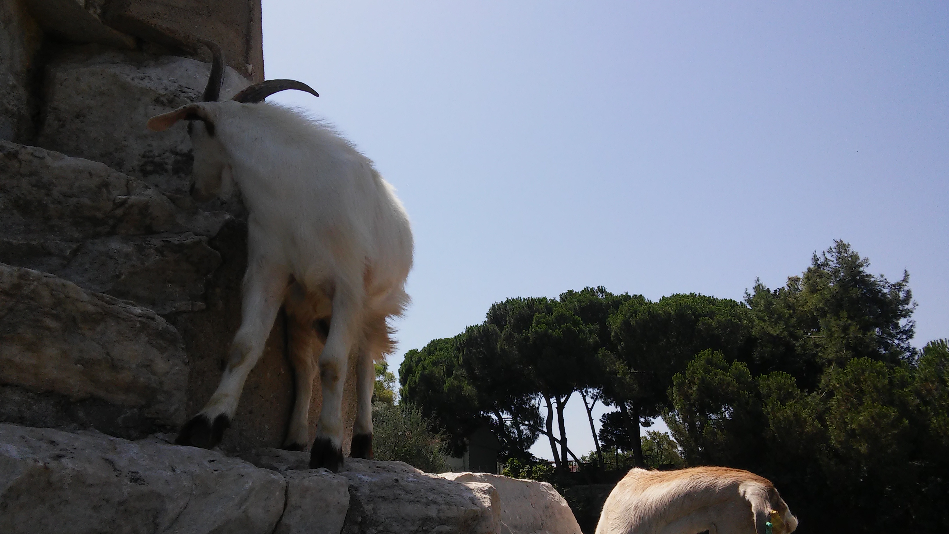 Подошло стадо коз. Козлик и козочка заскочили на верх колонны и с