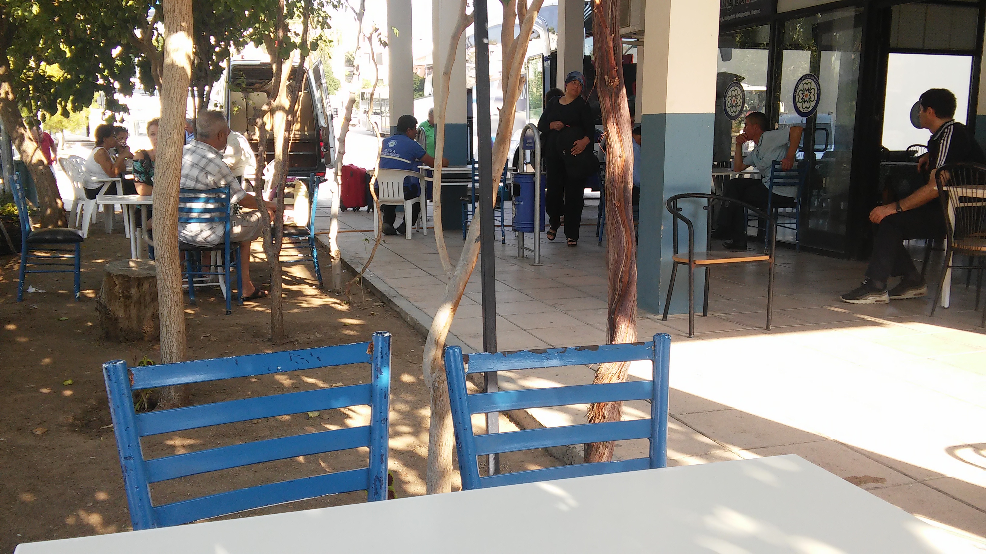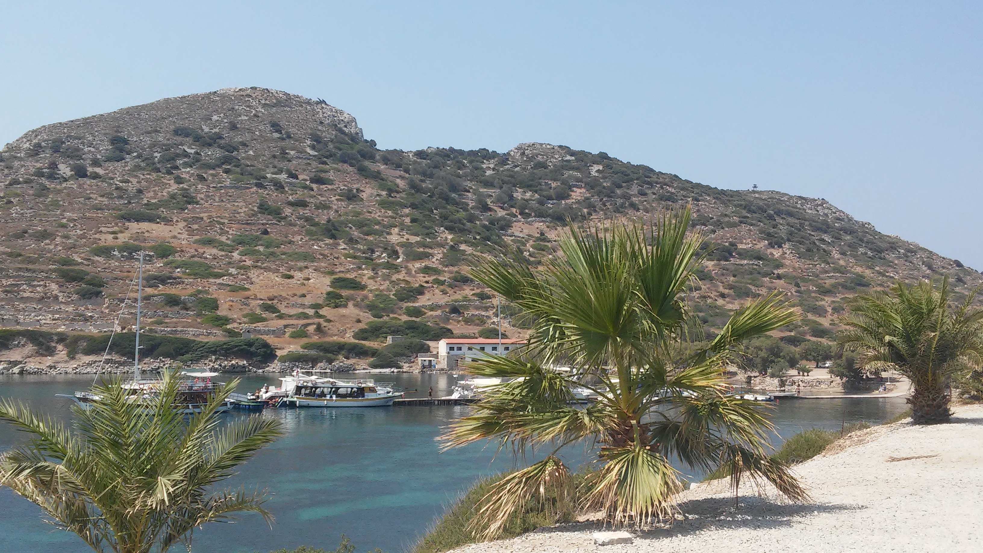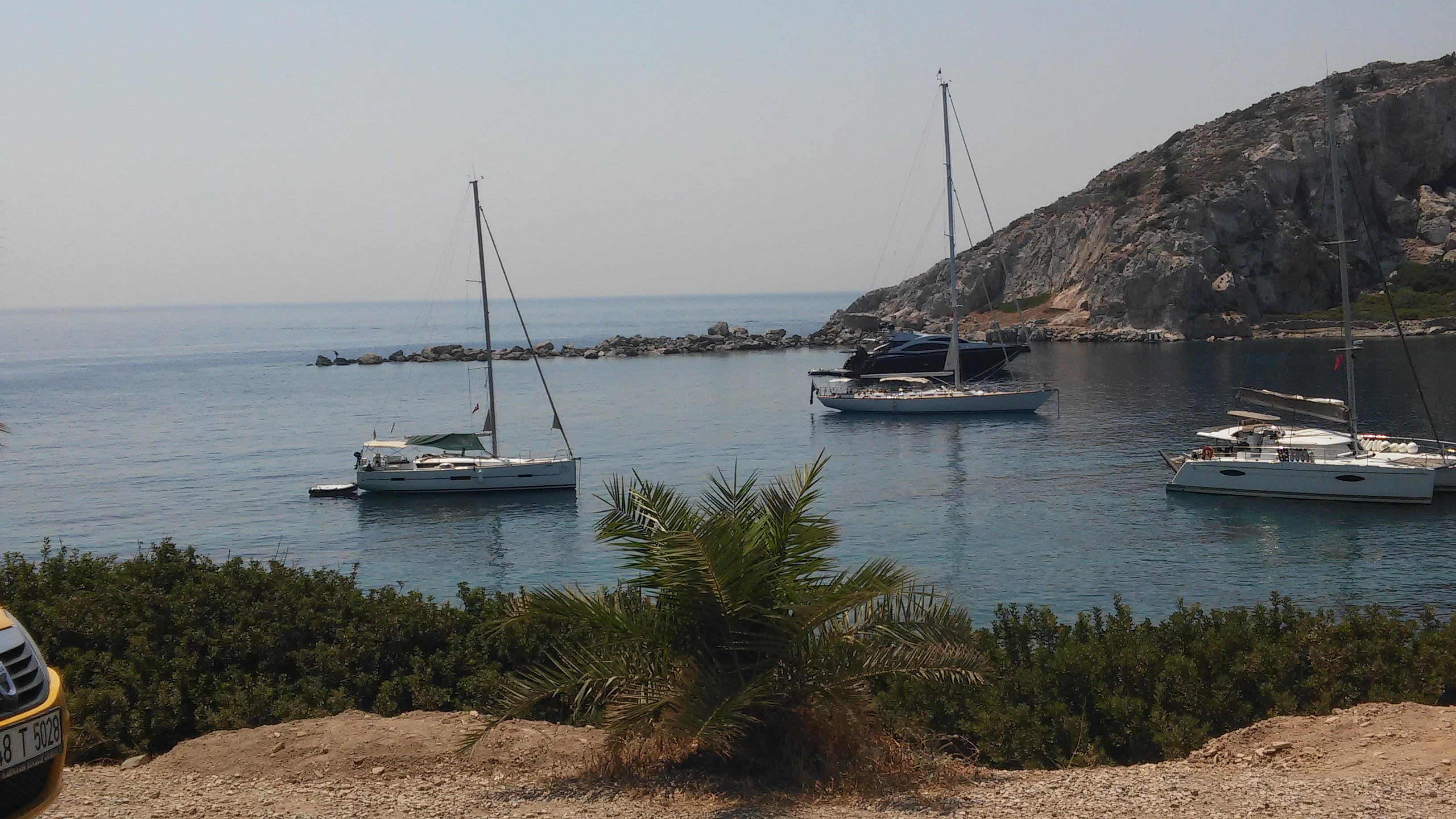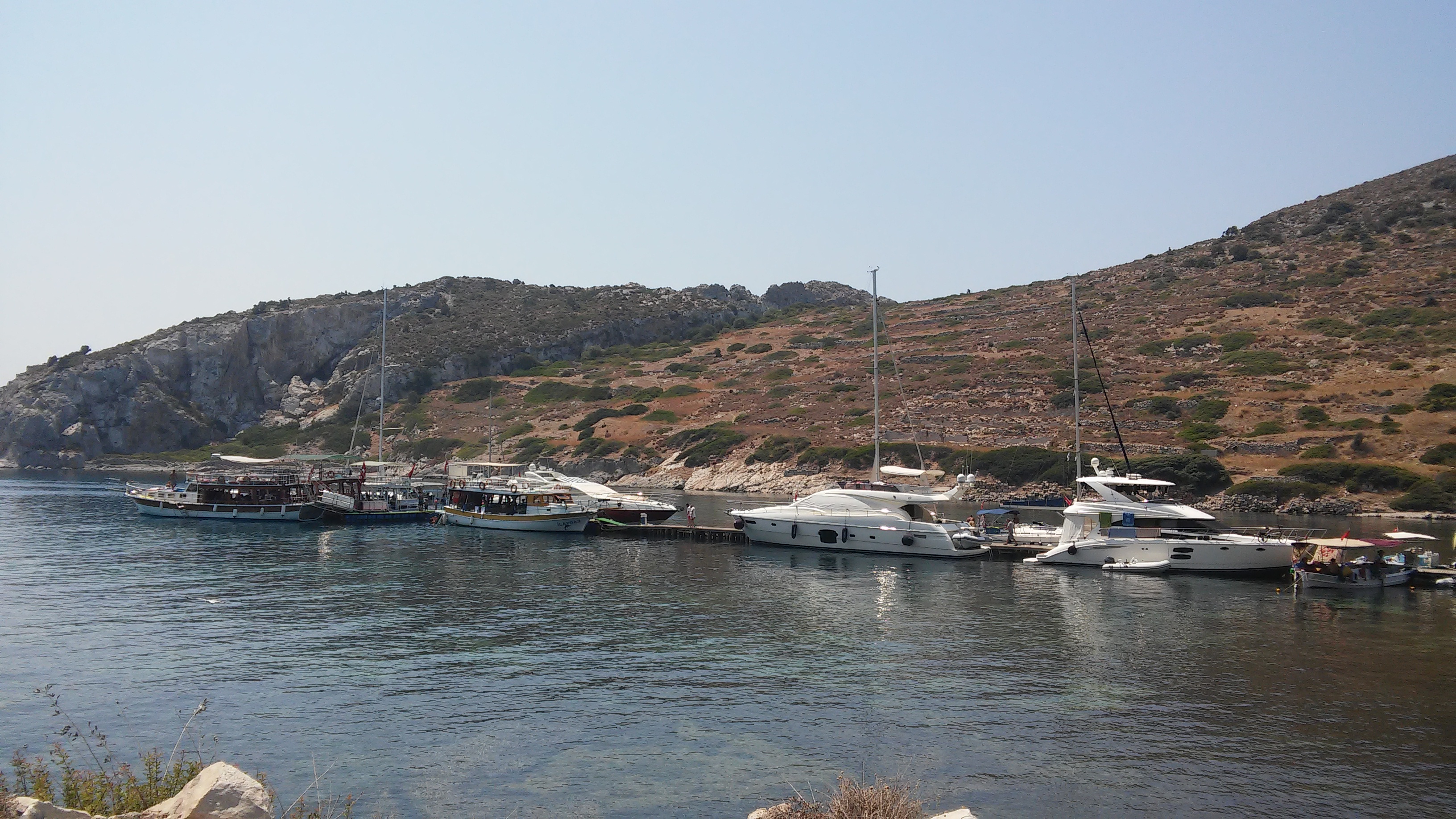 Из Мармариса на маршрутке я доехала до города Датча. Дорога из Мармариса в Датчу идет мимо хвойных лесов, гор, морских бухт. Автобусы в Книдос из Датчи ходят 2 раза в день. Пришлось ожидать полтора часа на отогаре. На обратном пути эта же стыковка заняла 5 мин. Можно было бы походить, посмотреть Датчу. Но в 10 утра солнце грело до 35 градусов в тени. Поэтому сидела в кафе пила чай, как делали водители и пассажиры. Расстояние из Датчи в Книдос около 30 км. Дорога идет наверх вдоль побережья Эгейского моря между гор с крутыми поворотами. Горы попадались необычные замшевые, светло-коричневые. Я удивилась, как водитель при такой крутизне все время разговаривал по телефону. У меня закладывало уши, как в самолете. Двум женщинам стало совсем плохо. Автобус заезжал во все маленькие селения на его пути и расстояние 30 километров преодолел за полтора часа.