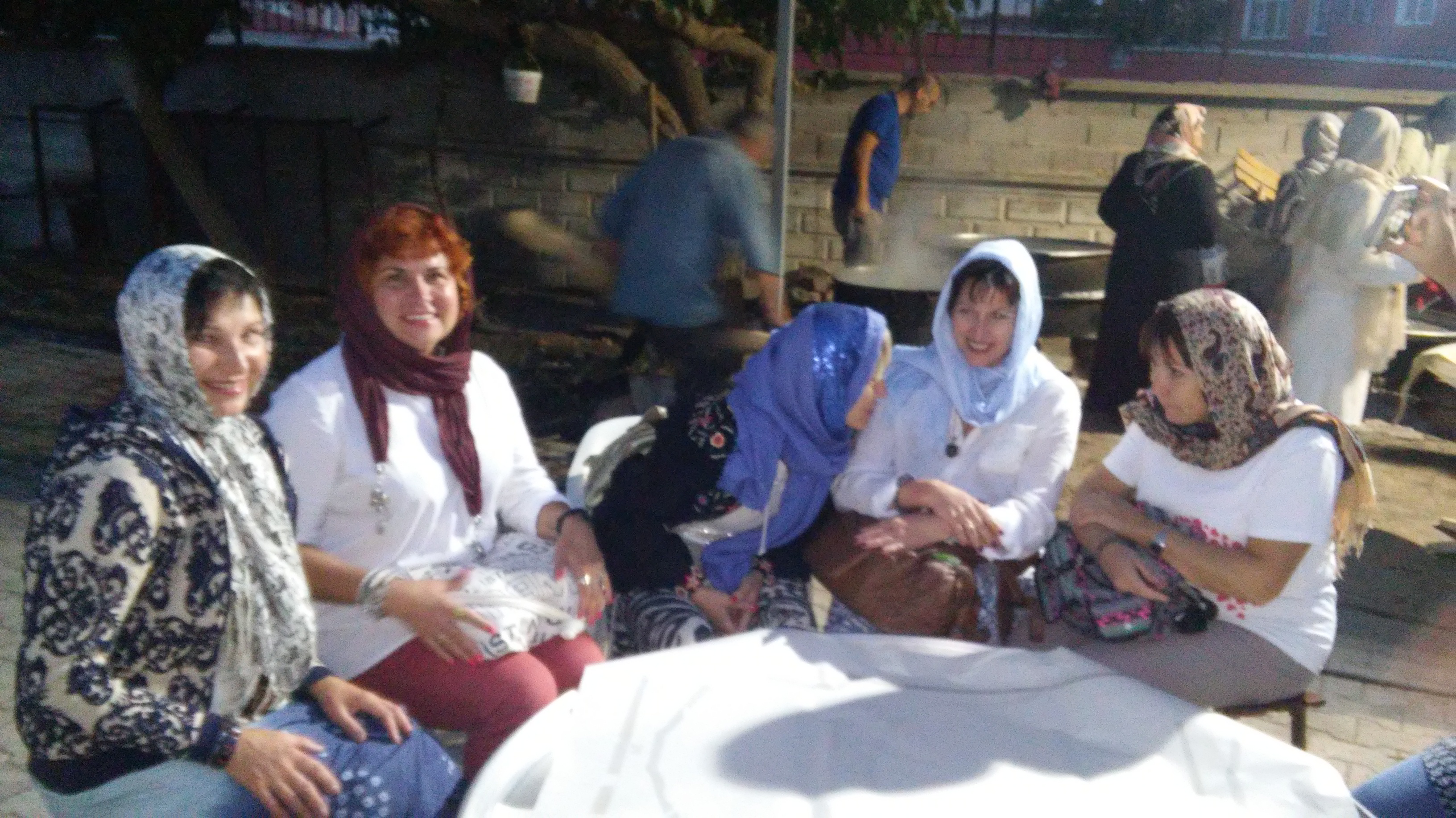 которыми принимали пищу женщины. Несколько мужчин варили еду в котлах на улице.