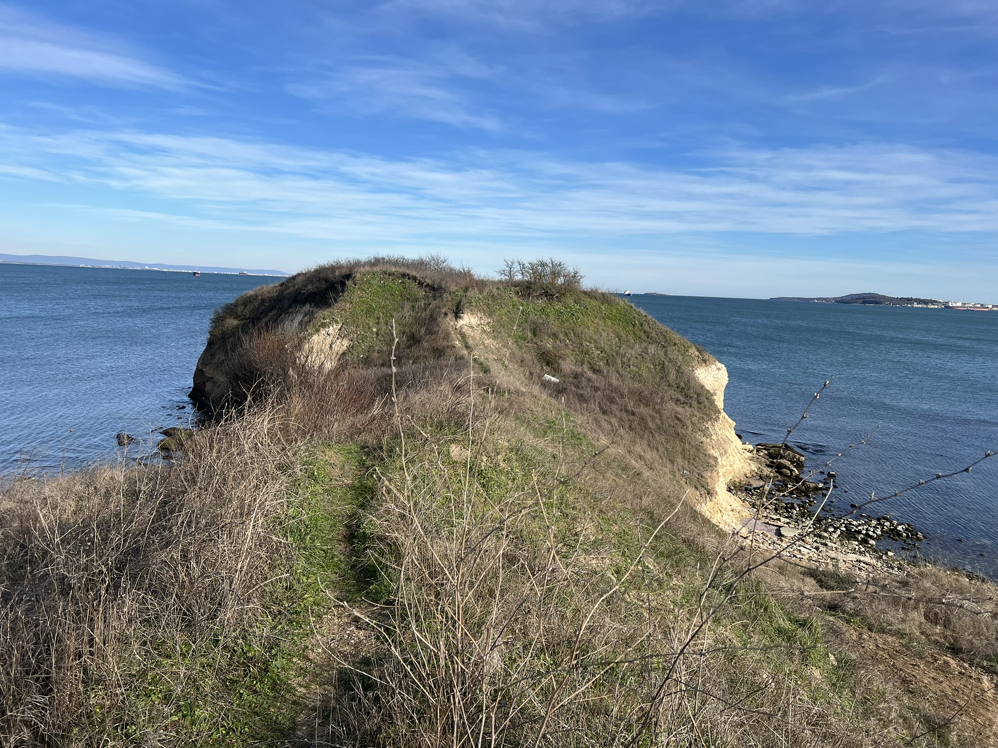 Наконец тропа расширяется и приводит на самую выступающую точку мыса. Все заросло травой и кустами. Виды потрясающие на Бургасский залив слева и на море, горы и приморские городки справа от мыса.