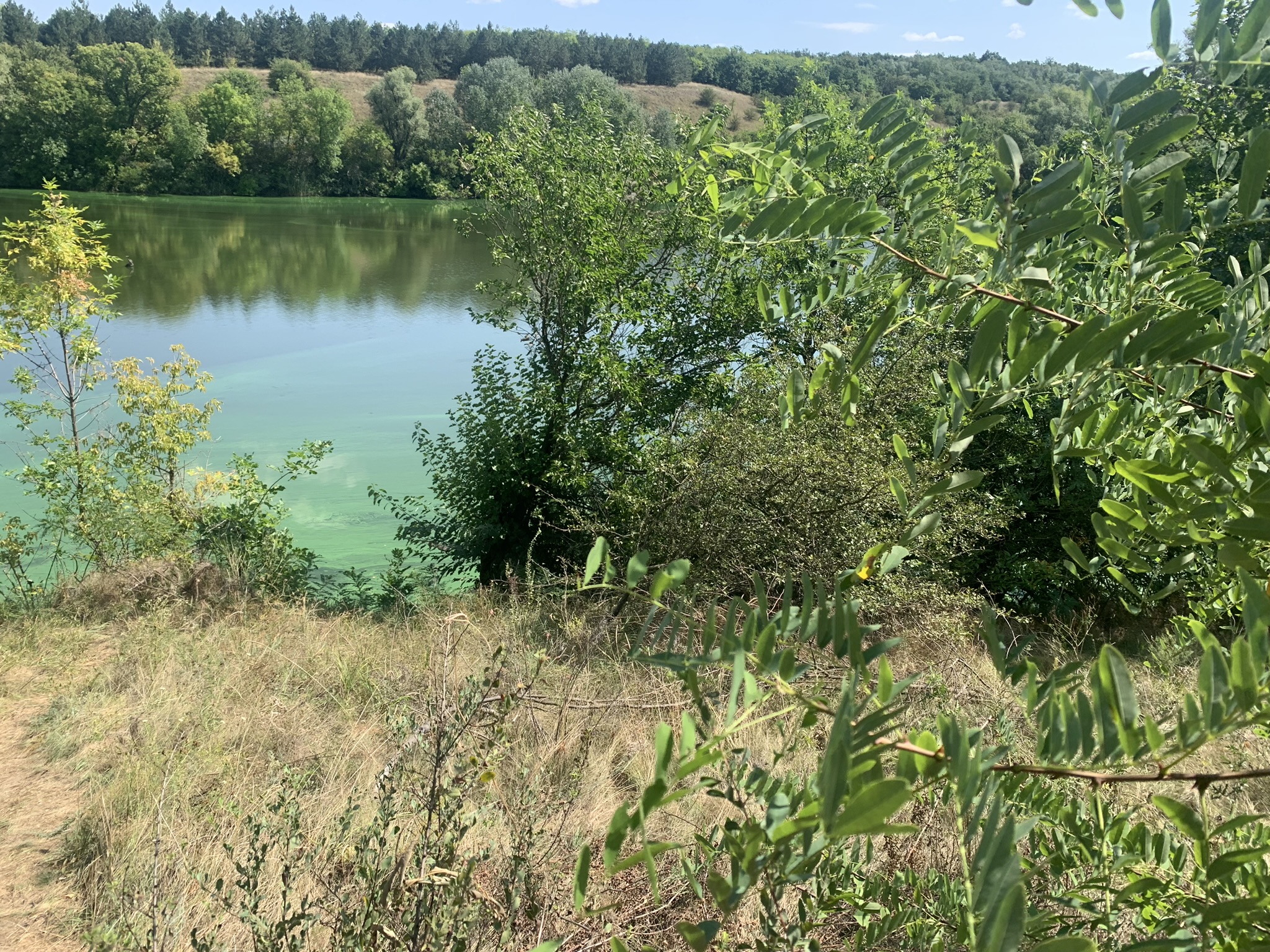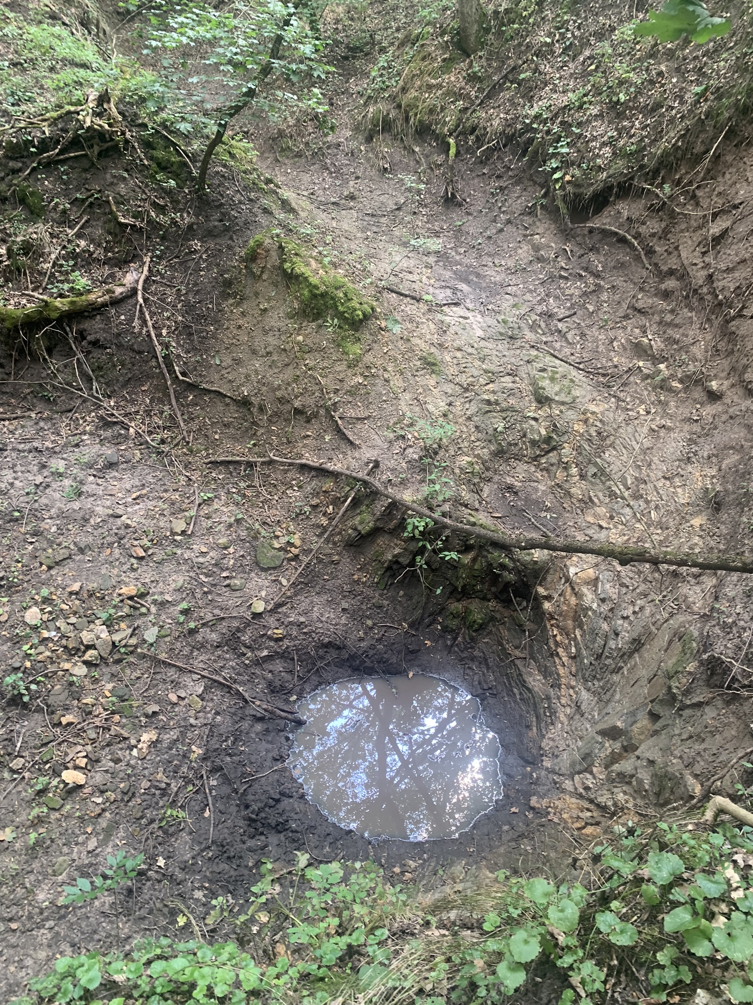 Ручей протекает в каменных породах. За тысячелетия породы вымылись и приобрели своеобразную форму. На поворотах ручья были расширения и небольшие озерца. На каждое я думала: “Может быть это купель русалок?” Но в книге было написано, что идти метров 300 вверх от Днепра по ручью. В какой-то момент я подумала, что книга написана давно и все это выдумки насчет купели и трехсотлетних дубов. Я взялась рукой за куст. Это оказалась крапива. Больно! Все, поворачиваем назад! - подумала я. И тут же мы увидели в глубоком провале купель. Вот так за пять шагов до цели, чуть не остановилась.