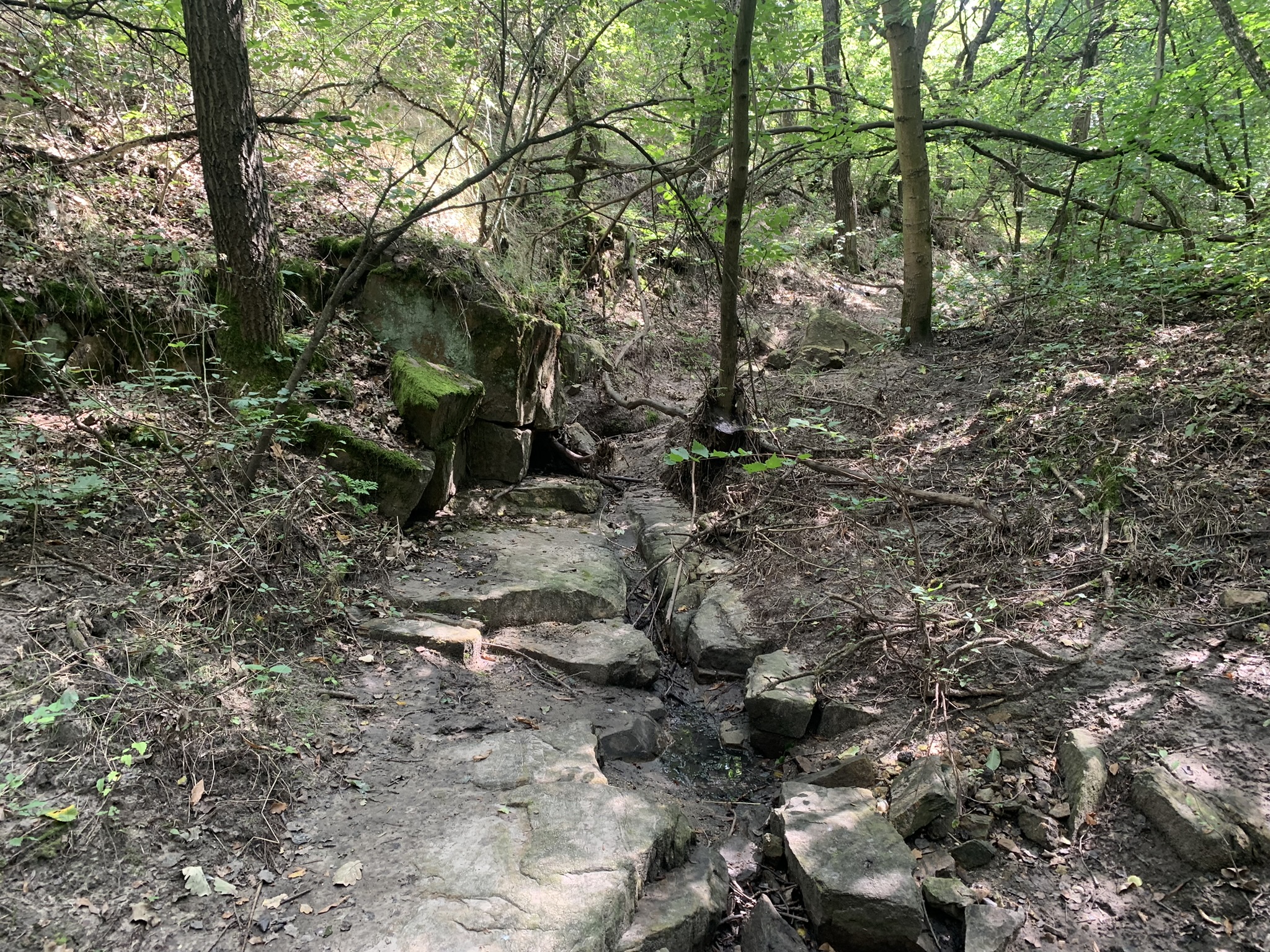Ми пішли руслом струмка. Русло було майже без трави і було видно, що тут під час дощу великим потоком йде вода. У серпні в сухий час ми пройшли струмком.