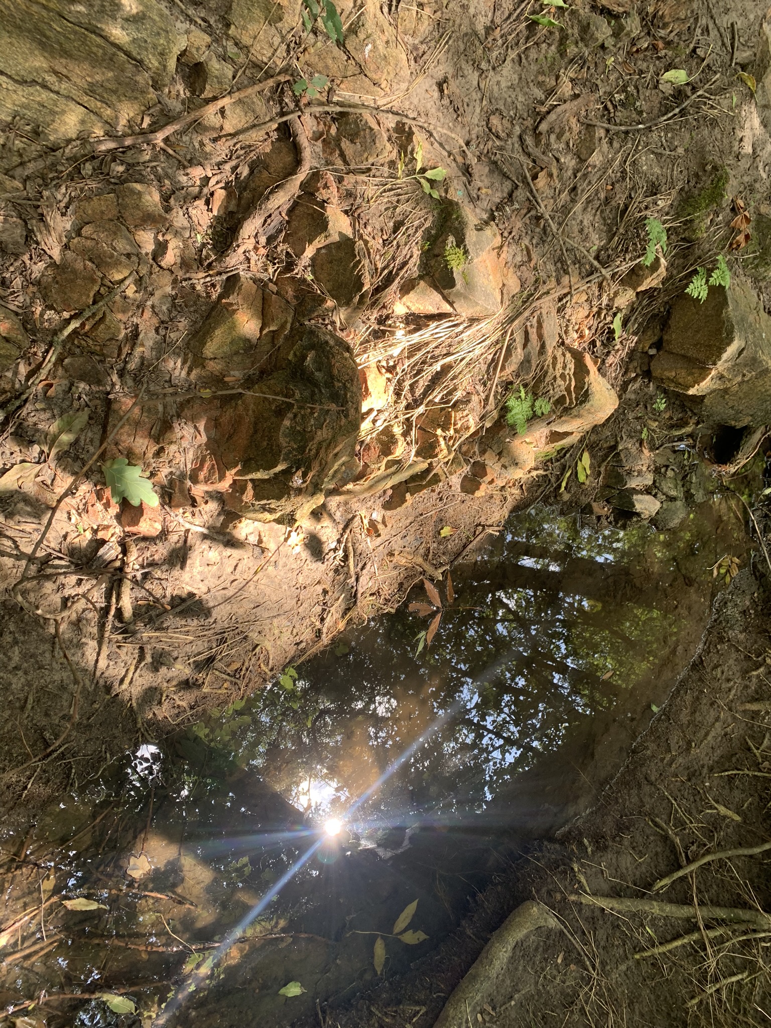Ручей делает несколько поворотов. В одном месте ручей сделал изгиб и образовался полуостров. Земля вдоль ручья была вся в ямках от следов кабанов и еще каких-то животных. Но, странное дело, как только мы зашли в дубовую рощу и пошли вдоль ручья установилась тишина. Я не слышала щебета птиц, не было насекомых и мелких животных. Было ощущение, что мы вошли в отдельную экосистему и ее обитатели наблюдают за нами. Неудивительно, что мы ищем купель русалок. В такой загадочной тишине, при полном отсутствии людей, и в связи, с этим с чистотой вокруг, легко поверить в существование леших и русалок.