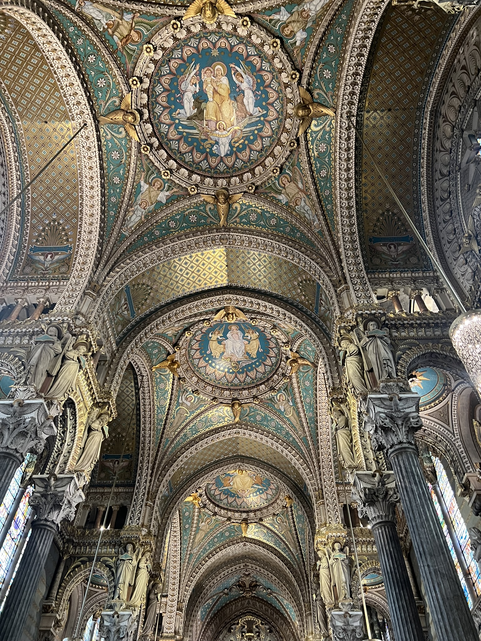 На самой высокой точке холма находится красивейшая базилика Нотр дам де Фурьер. Вход свободный. Внутри гармонично подобрано золото с голубым цветом.