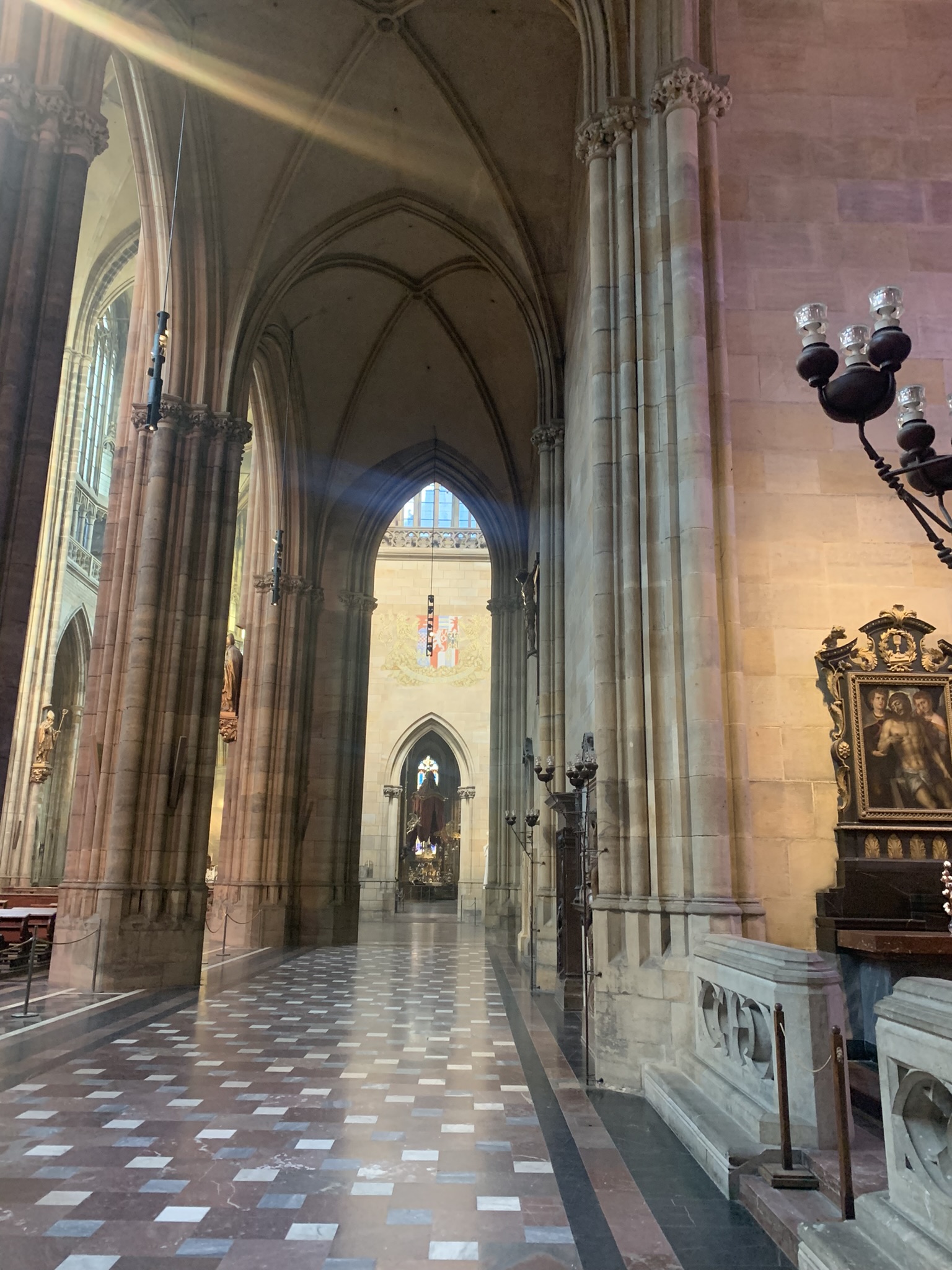 Еще один случай произошел с собором Святого Витта. Когда мы купили билеты, то нас не пропустили в храм. Там шла предпасхальная служба. Приехали в собор Святого Витта на следующий день за 40 минут до закрытия. И о чудо! Я впервые была в этом соборе, практически, при полном отсутствии народа.