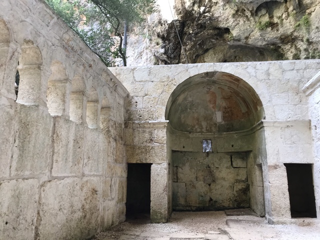 Да, в этих местах в античные времена была активная духовная жизнь. Если обойти стену и зайти внутрь, то откроется вид на развалины вперемежку с деревьями и кустарниками. Развалины находятся ниже основной площадки храма на метр или полтора. Похоже это то, что осталось от античных и римских храмов и поселений.