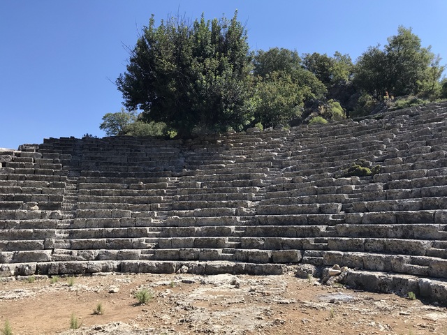 Гробница создана в виде каменного дома, заметного  издалека. Меня дорога привела к амфитеатру II века до н.э.Театр состоит из 27 рядов, разделенных на 9 клинообразных секторов. Театр вмещает 3200 зрителей. Перед ним находится большая круглая площадь. Похоже, она и была такой в лучшие  времена города.