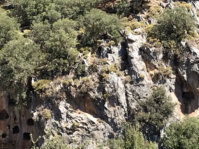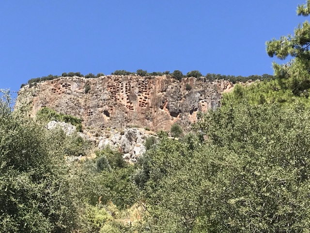 Я поднялась на самый верх амфитеатра. Отсюда открывается красивый горный пейзаж. Напротив стоит высокая гора с  сотнями пещерных гробниц. Издали они, чем-то напоминают птичьи гнезда. Впрочем, следуя взглядам ликийцев это одно и тоже. Они верили, что после смерти души умерших превращаются в волшебных птиц, улетающих в высшие миры.