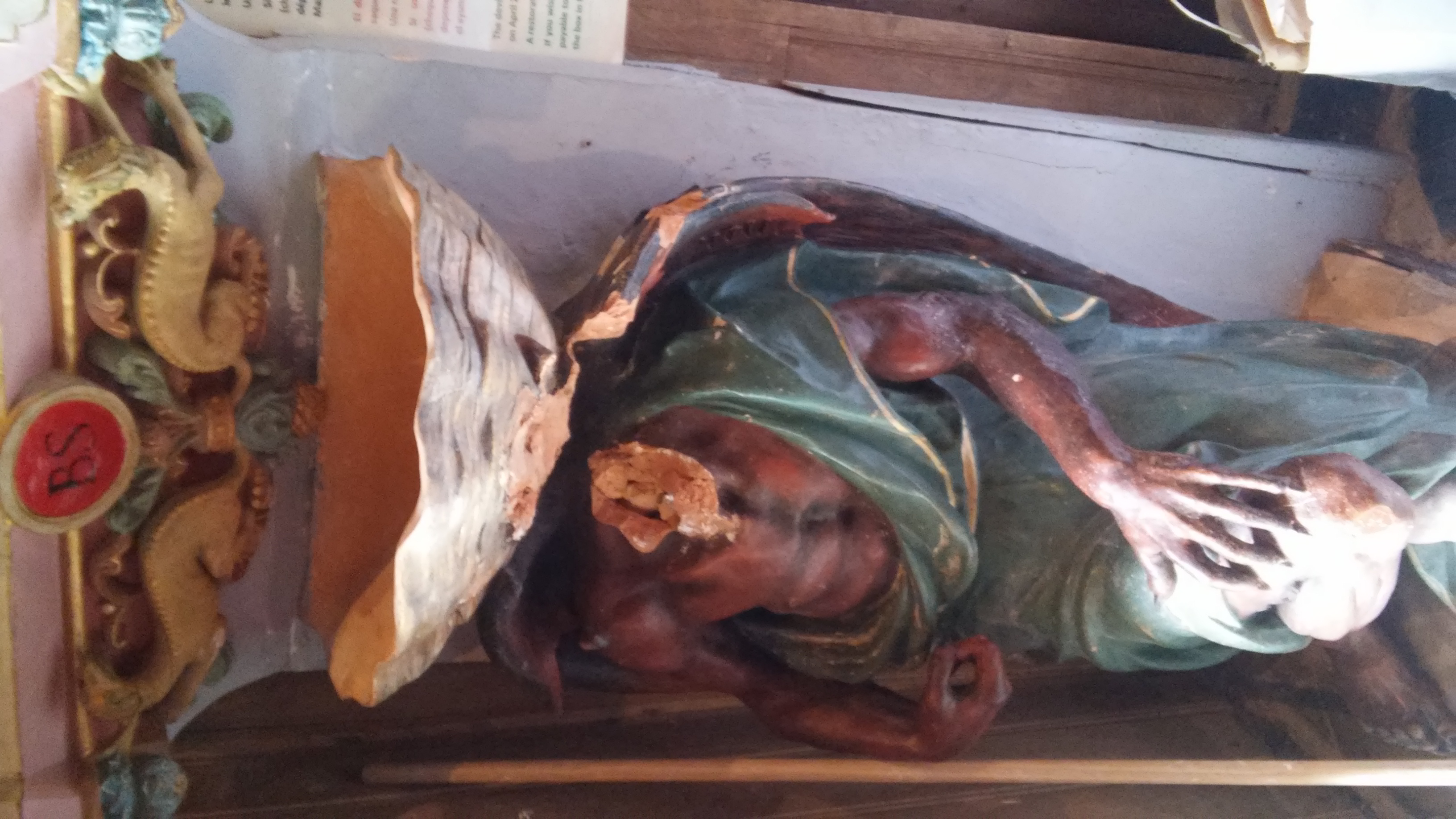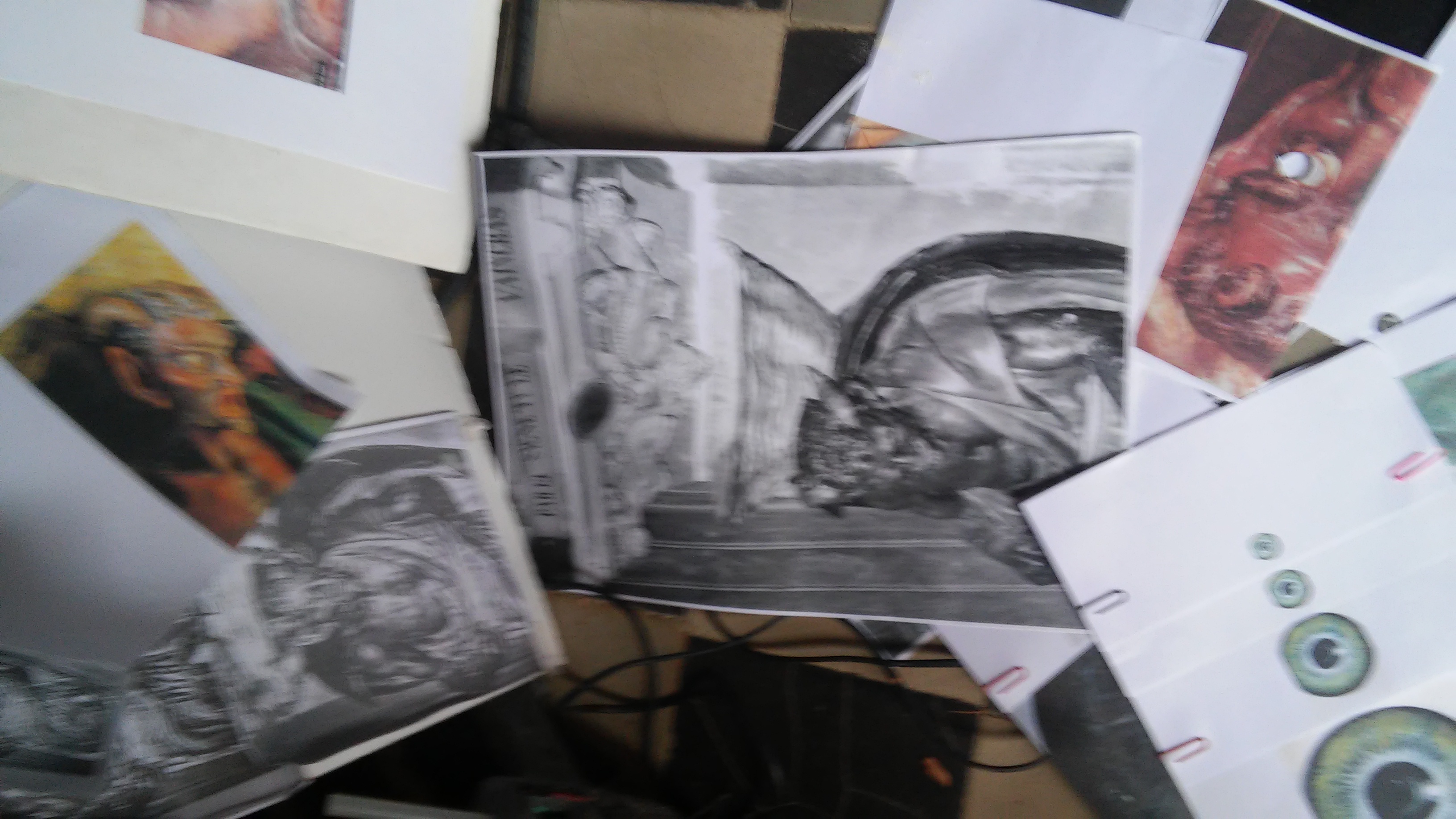 Ненормальная фанатичная женщина разбила голову скульптуре. На полу только листики с фотографиями головы и глаз.