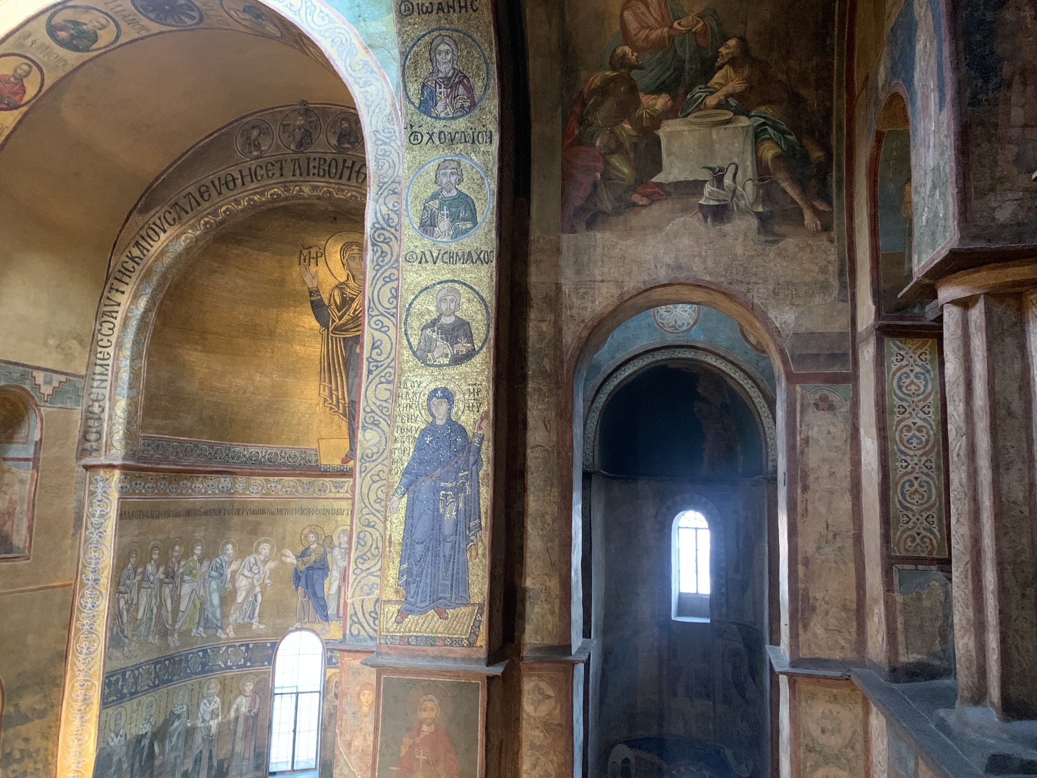Я ожидала от тысячелетнего храма низких потолков, убогости, скудости, темноты, а вышло наоборот. Сводчатые проемы, идущие вдаль резонируют с подсознанием, настраивают на высшие мотивы. Много света. В храме заметно влияние Византии. Я была не один раз в соборе Святой Софии в Стамбуле, когда ее еще не переделали в мечеть, посещала фрески в монастыре Хора (музее Карие), тоже пока не закрыли для мечети. Но здесь в этом соборе получилось нечто особое - смесь Руси, Византии, первого христианства и древних знаний. Я теперь по-другому смотрю на киевскую Русь, на людей, живших на этой земле. Они не были невежественными и темными. Все, наоборот.