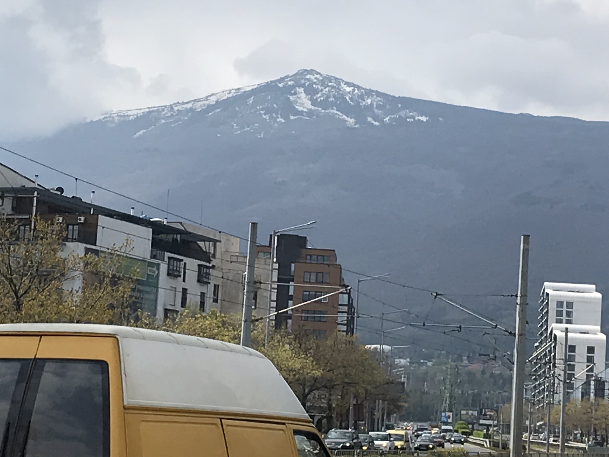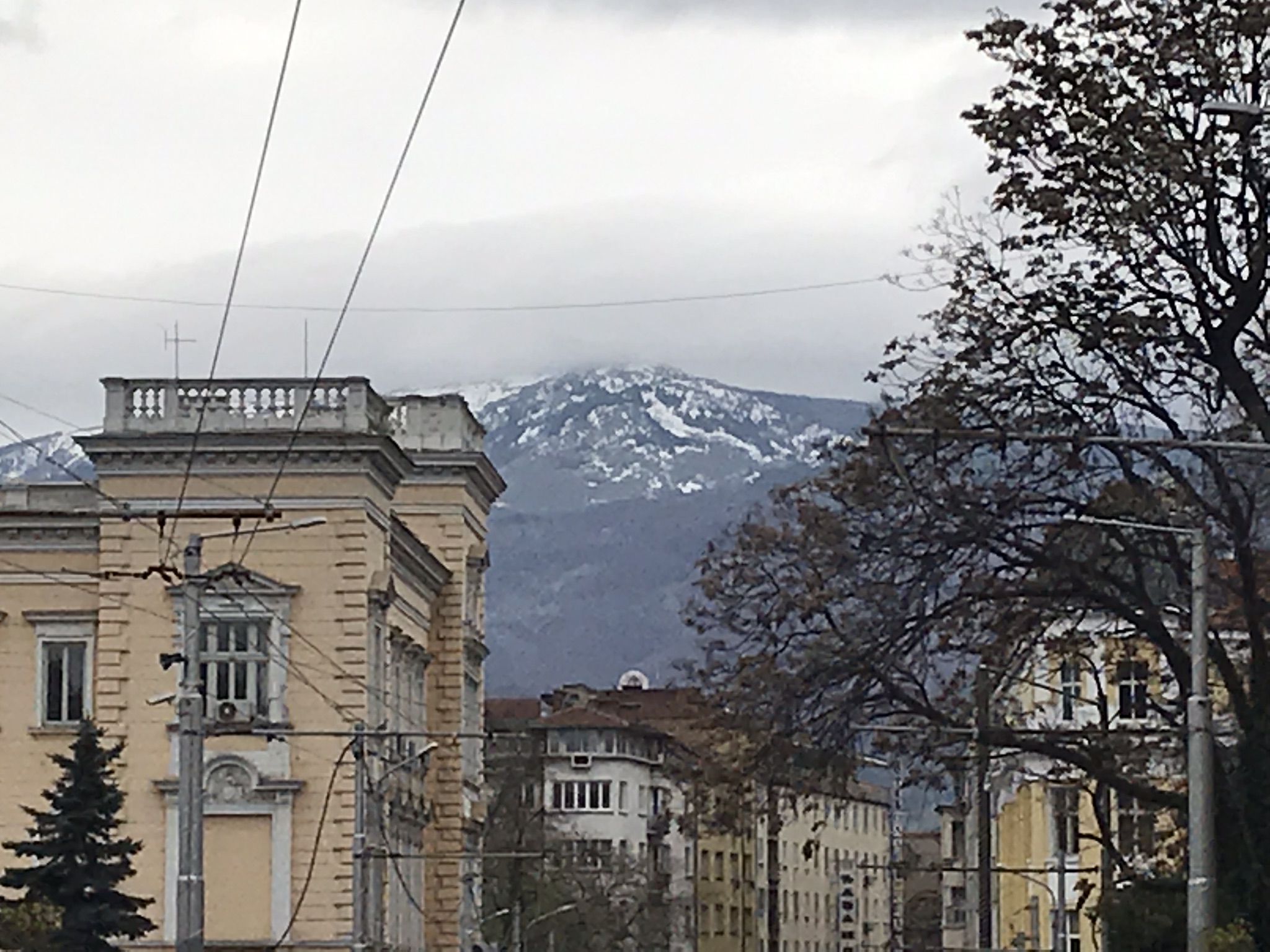 Гора Витоша, в ясную погоду, белеющая снежными вершинами над Софией, прячется в тумане.